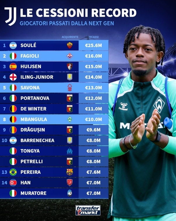 尤文新生代卖人榜:苏莱2560万欧去罗马居首,法乔利第2赫伊森第3